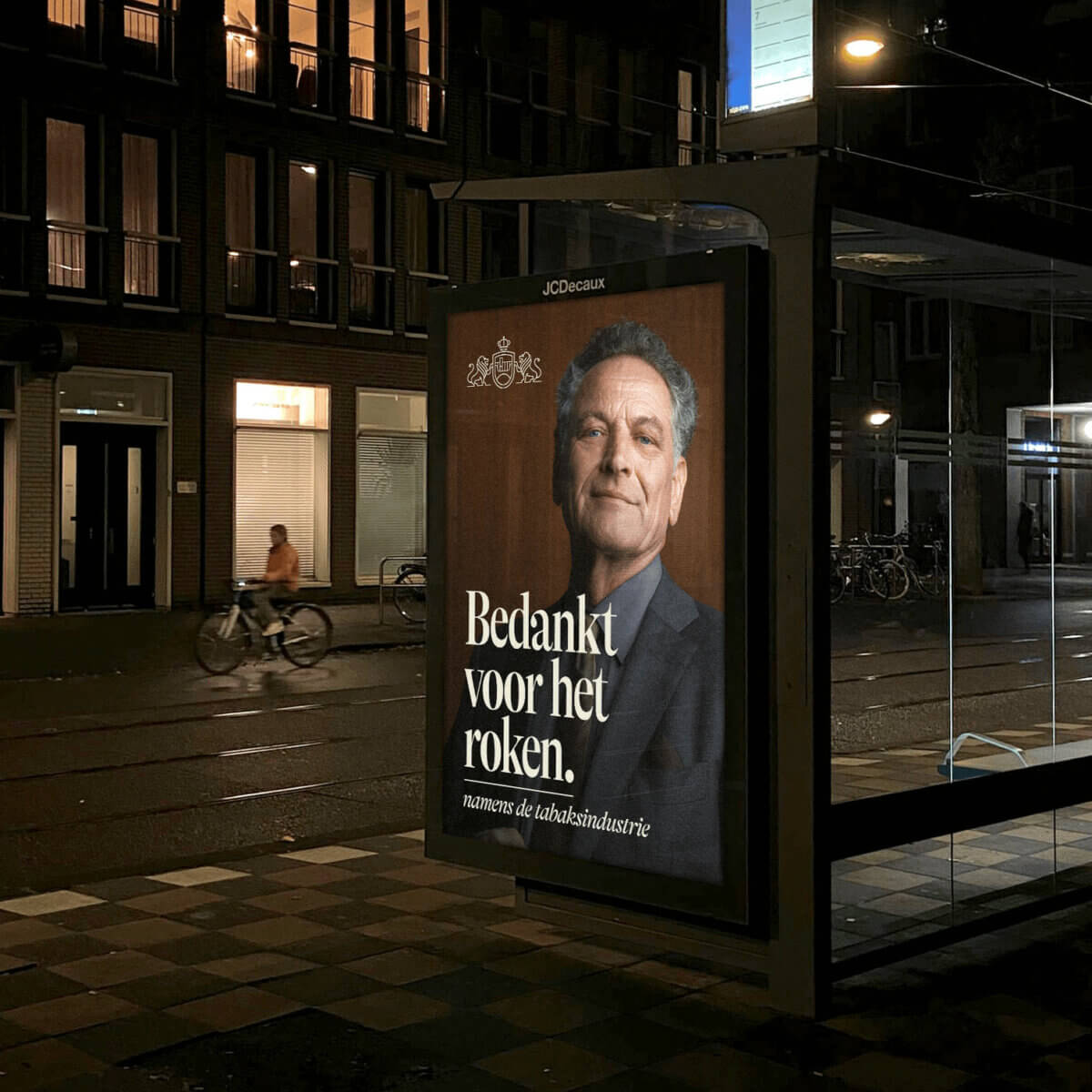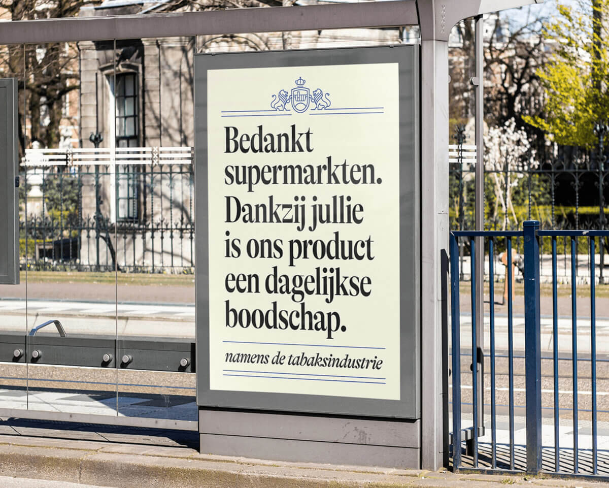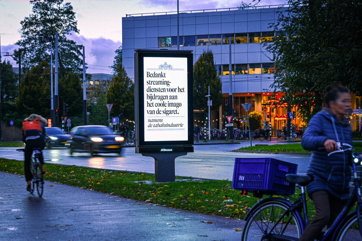 We initiated the campaign with a ‘Thank You for Smoking’ campaign, featuring the tobacco industry as the sender. The campaign comprised a corporate video launched across various channels, including TikTok, YouTube, and NPO. Additionally, we implemented an out-of-home campaign targeting key locations like supermarkets and publishers, which support the tobacco industry by selling and/or promoting its products.